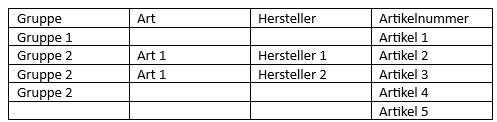 Sie haben die Möglichkeit, die Verwaltungstabelle flach zu halten oder sehr detailliert anzulegen. Falls Sie aber am Ende Ihrer Geschäftsfälle detaillierte Auswertungen über Gruppe, Art und Hersteller aller Reparaturteile benötigen, so müssen Sie dies bereits bei der Einrichtung der Verwaltungstabelle berücksichtigen.